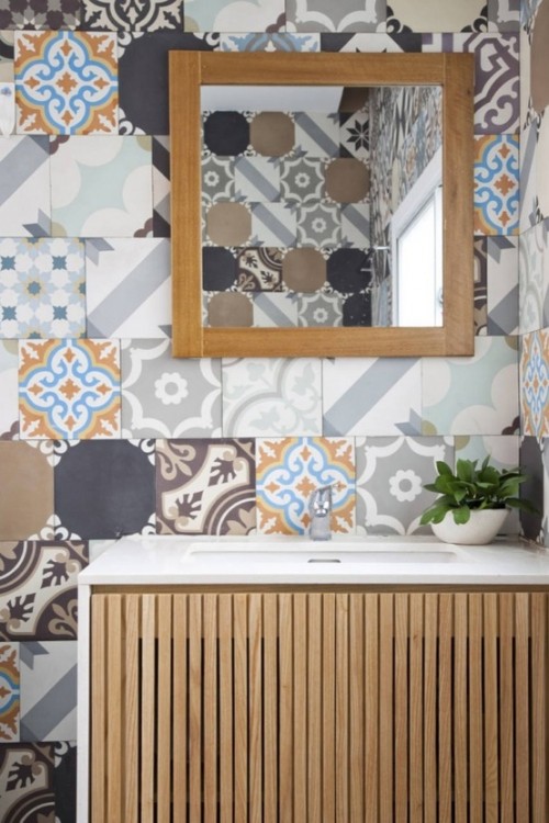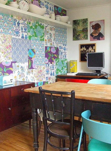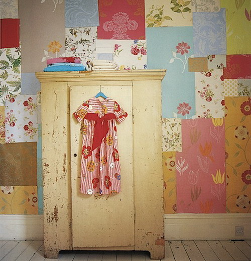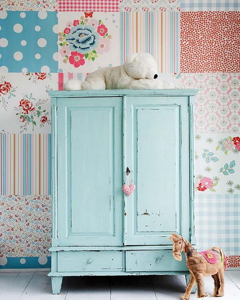 Chiếc tủ cũ nhưng không hề lạc lõng với sự kết hợp màu sắc hài hào giữa giấy dán tường và màu sơn tủ
