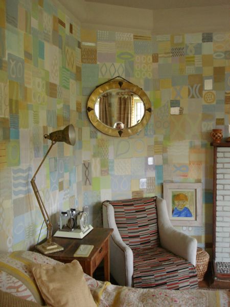 Giấy dán tường với các ô màu và họa tiết đơn giản khiến khung cửa sổ thêm sống động hơn